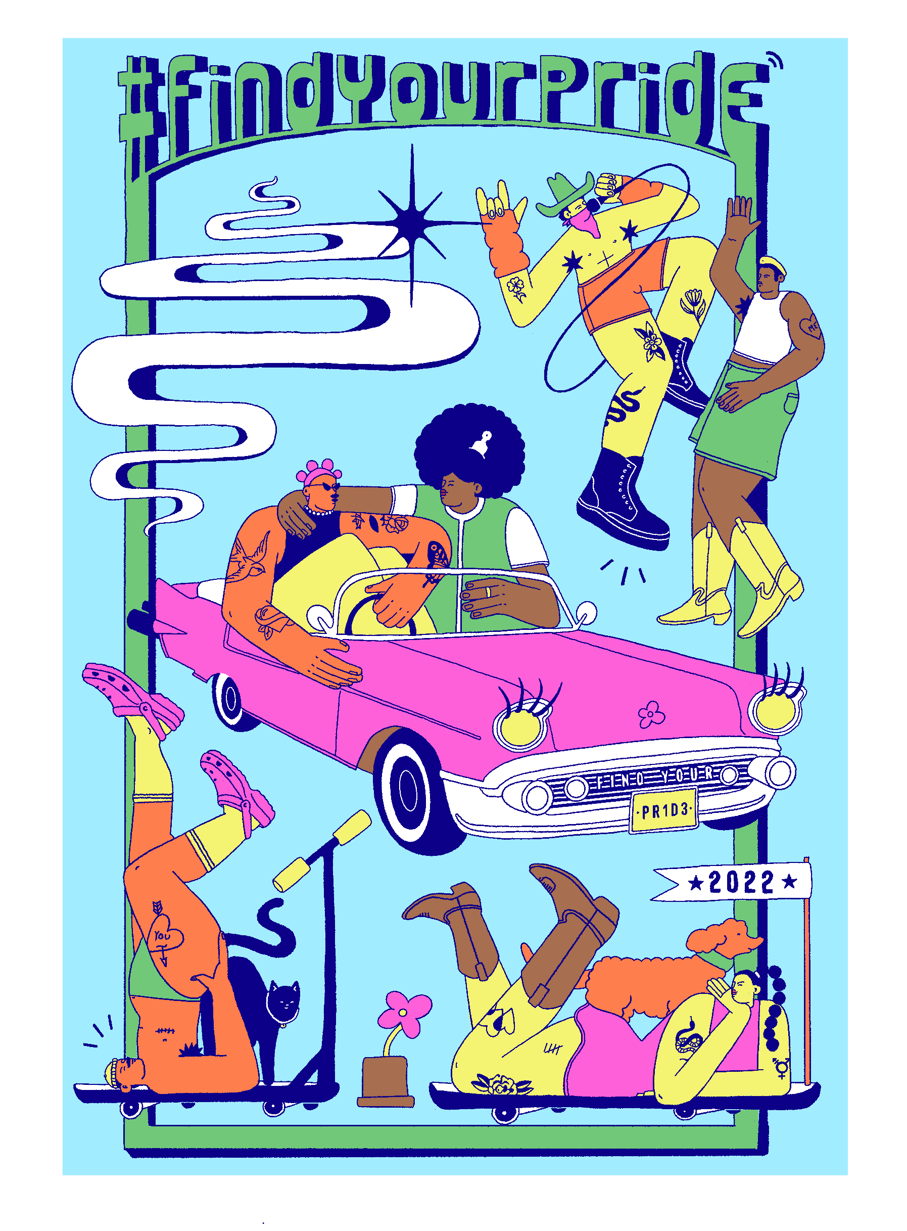 This design was made for a YouTube pride T-shirt. I wanted to portray queer joy through the characters I used. These designs where printed onto the back of thrifted bowling t-shirts and given to queer influencers for pride 2022.